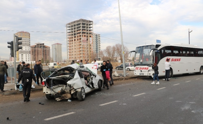 Sivas’ta yolcu otobüsüyle otomobilin çarpışması sonucu meydana gelen trafik kazasında polis memuru hayatını kaybederken nişanlısı ağır yaralandı.